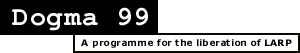 The abandonment of conventional LARP - the current conventions of LARP are merely an infant stage and should be abandoned. In the future, it should be impossible to speak of "conventional" LARP, as no conventions should exist. What we in the Dogma 99 manifesto term "conventional" LARP might one day be called "primitive", "fallen" or "corrupt" LARP.